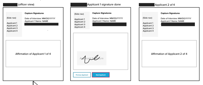 The button colors streamlined communication between the officer, interpreter, and applicants — Instructing click "red” or “blue” kept the signature process moving smoothly.